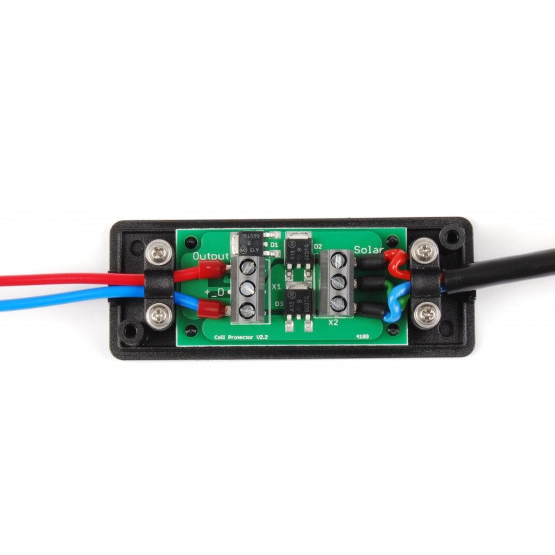 The cell-protector has to be mounted / operated in a dry place, it must not become wet or moist with dew. The cable of each single SunWare solar module has to be conntected to one single cell-protector. Only behind the cell-protector, modules could be connected in series or parallel.