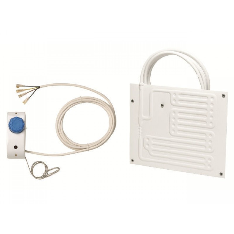 Systeem plaatverdamper voor horizontale en verticale montage, zelfdichtende ventielkoppelingen, flexibele verbindingsleiding van ca. 2 m, traploos instelbare thermostaat (extern te monteren met blauwe draaiknop en LED controlelampje in witte kunststof behuizing), elektrische leiding van ca. 3 m